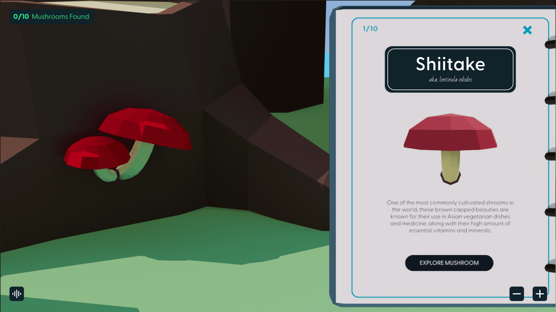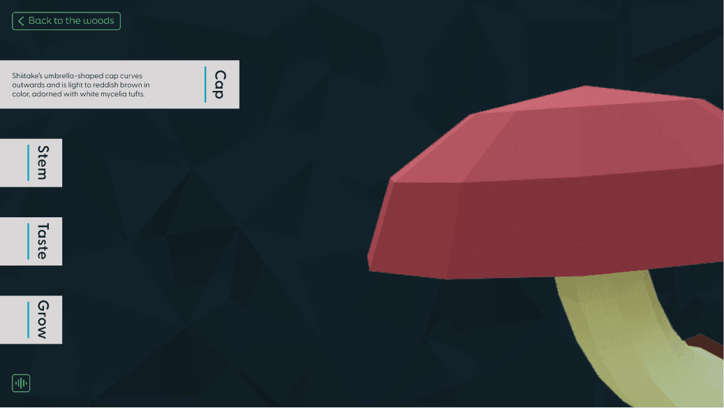 Book-like UI, featuring condensed information about the mushroom as well as a picture of its model