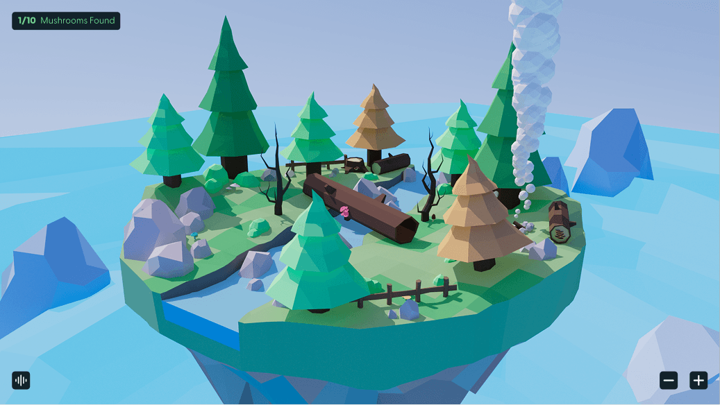 I used this example as inspiration for the perspective of the 3D forest, as well as how to handle hotspots. I also took inspiration from the “happiness level” for the “mushrooms collected” tracker, as incentive for the user to keep exploring.