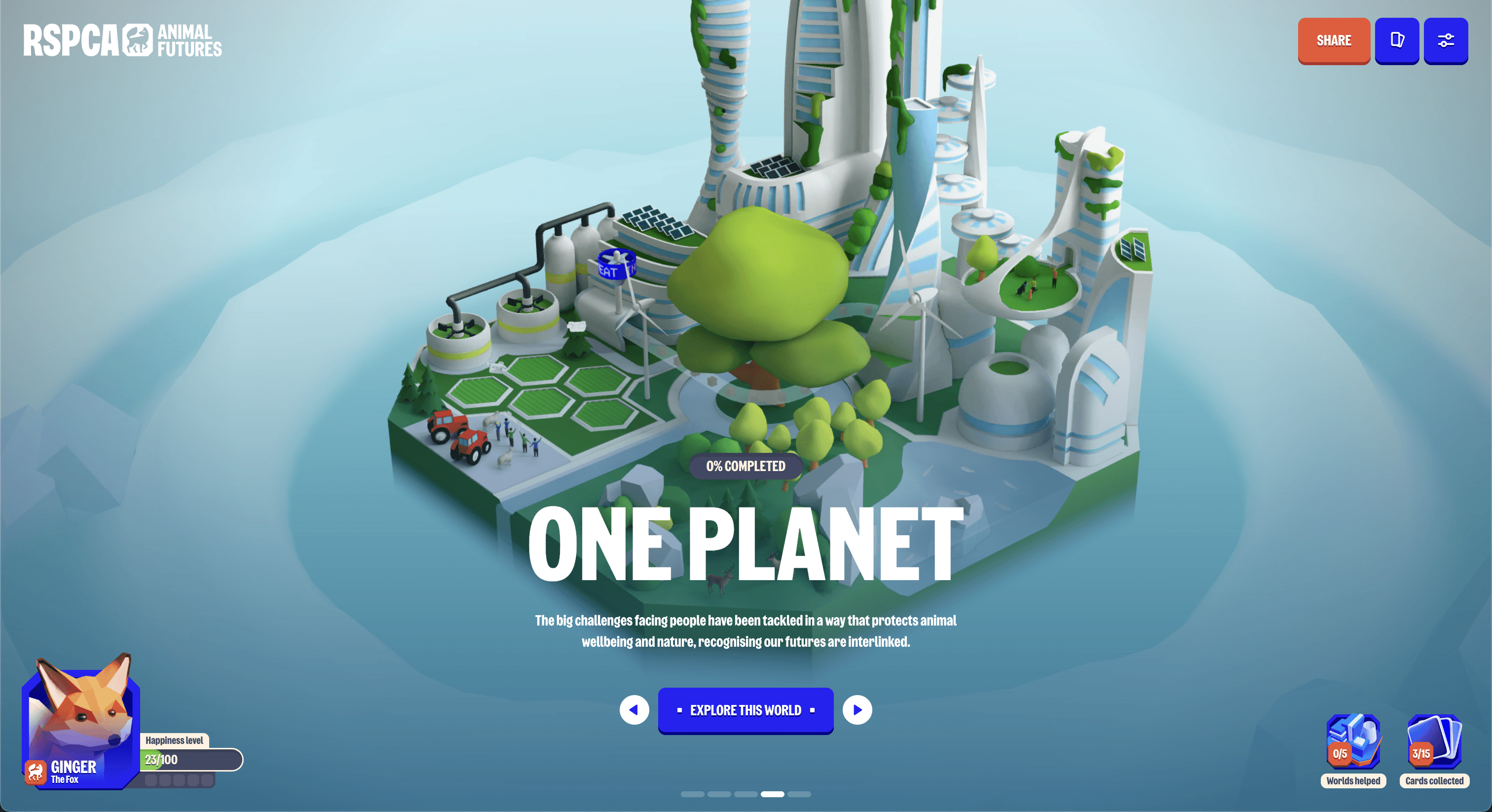 Animal Futures is a 3D interactive website that presents five hypothetical futures and their impact on groups of animals.