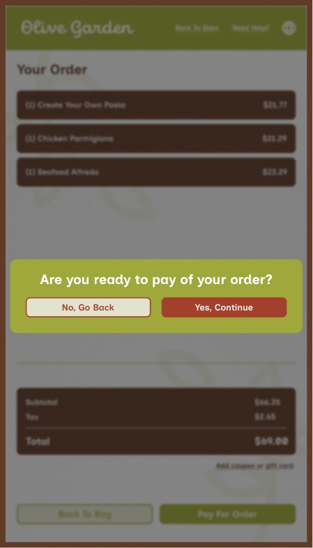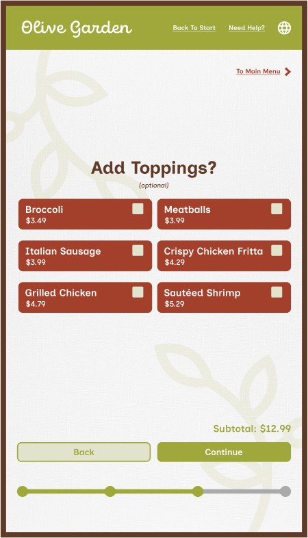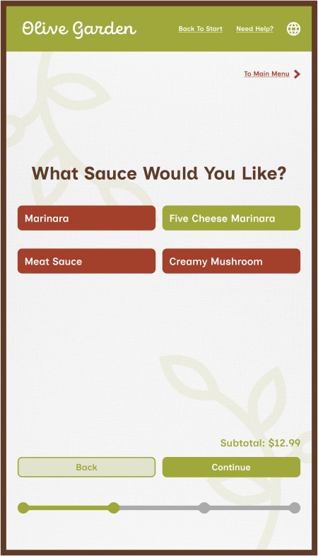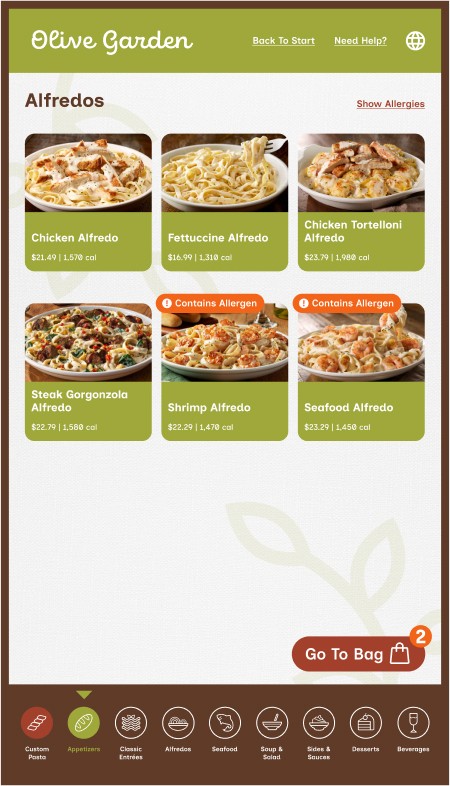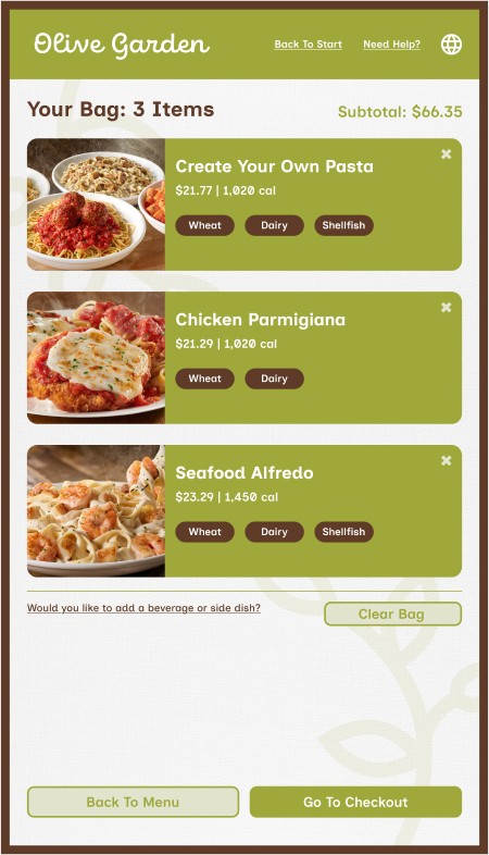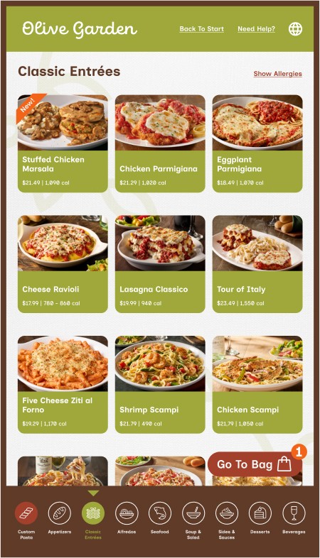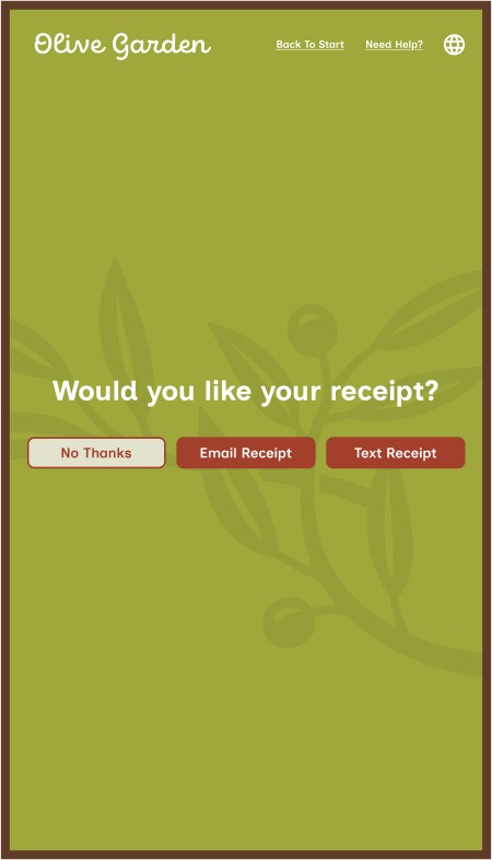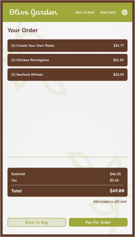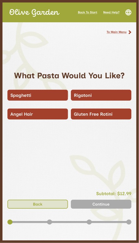 However, Olive Garden also allows for takeout, a process that mostly removes the traditional sit-down and eat dining experience, along with that direct customer to server interaction. This kiosk aims to provide the same brand and welcoming feeling to that of actually dining within the establishment while ordering through a digital interface.