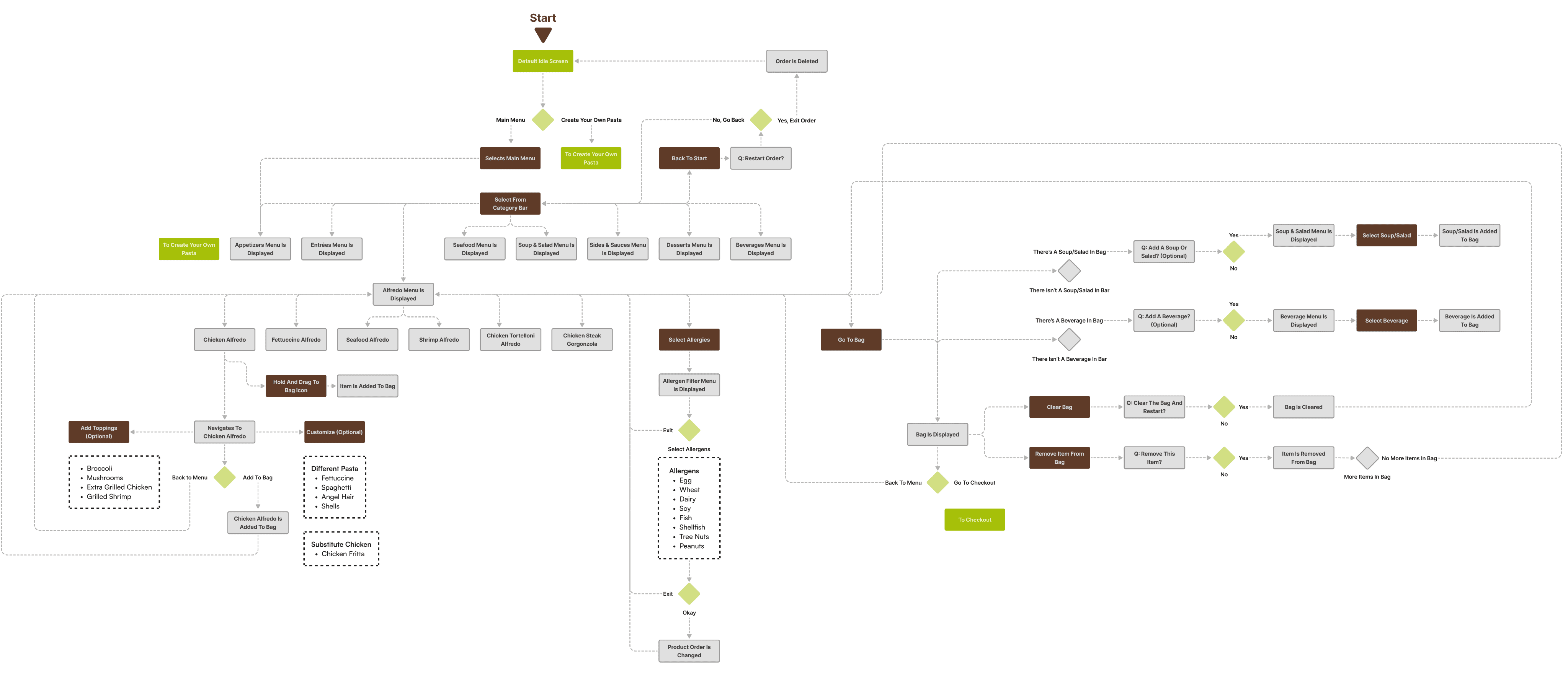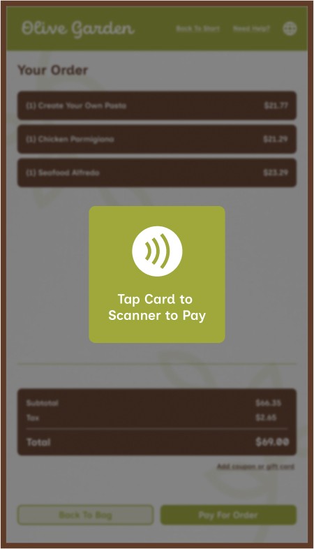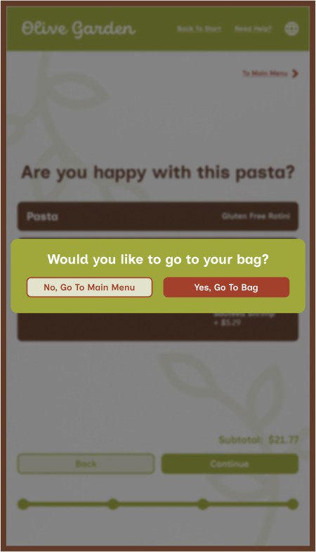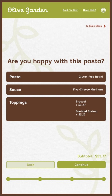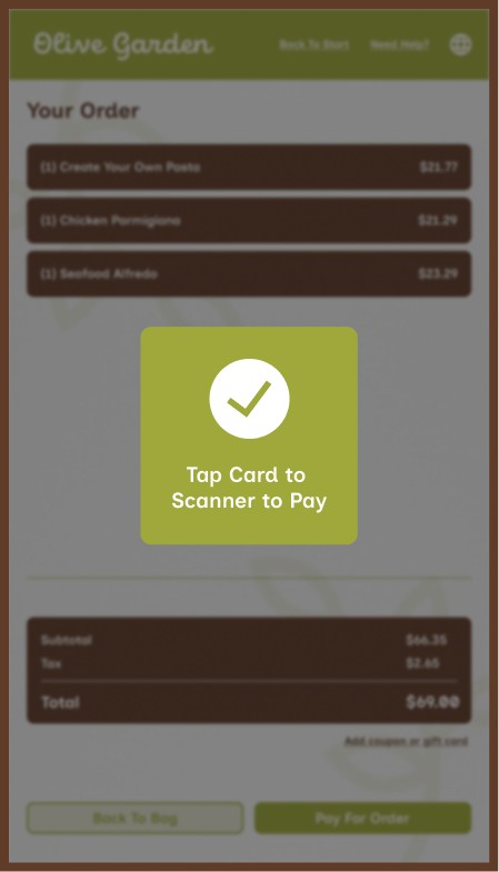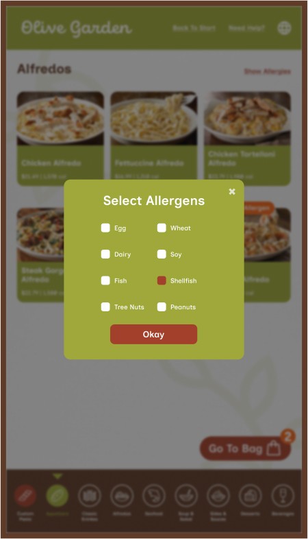 However, Olive Garden also allows for takeout, a process that mostly removes the traditional sit-down and eat dining experience, along with that direct customer to server interaction. This kiosk aims to provide the same brand and welcoming feeling to that of actually dining within the establishment while ordering through a digital interface.