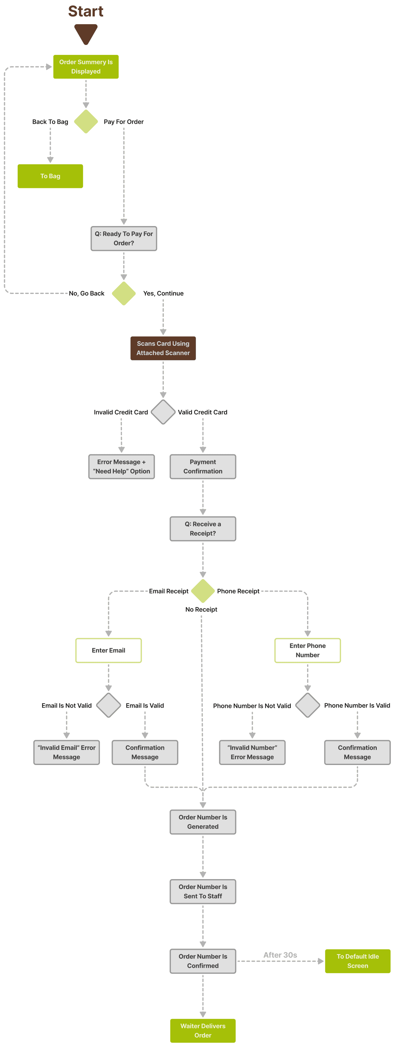 Additional hardware considerations include an adjustable stand would allow the kiosk to tilt up and down, an easily accessible credit card reader attached to the bottom, ports for power, HDMI, USB, and display, a camera attached to the bottom for scanning coupons, and an audio jack that allow hard of sight users to plug in headphones for screen reading.